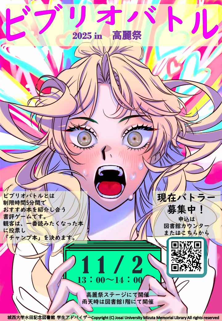 観客の方は、事前申請不要です。 会場へ直接お集りください。投票について 観客は一番読みたくなった本に投票し、「チャンプ本」を決めます。 ※途中からの観戦もできますが、投票は試合を最初から最後まで観戦した方のみとなります。 ぜひ全員の発表を聞いて、投票にご参加ください!