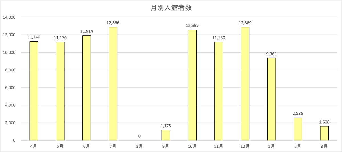 | 合計 入館ゲートのみ | 11,209 | 11,124 | 11,851 | 12,805 | 0 | 1,173 | 12,478 | 11,095 | 12,757 | 9,289 | 2,527 | 1,561 | 97,869 | |||||