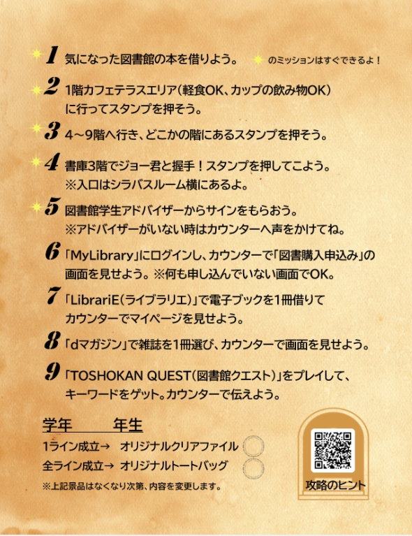 図書館を完全再現したRPGゲーム「図書館クエスト」でビンゴを完成させよう。 お題は9つ!完成したら、そのスクリーンショットを実際の図書館カウンターに見せてね。 景品がもらえるよ!! |