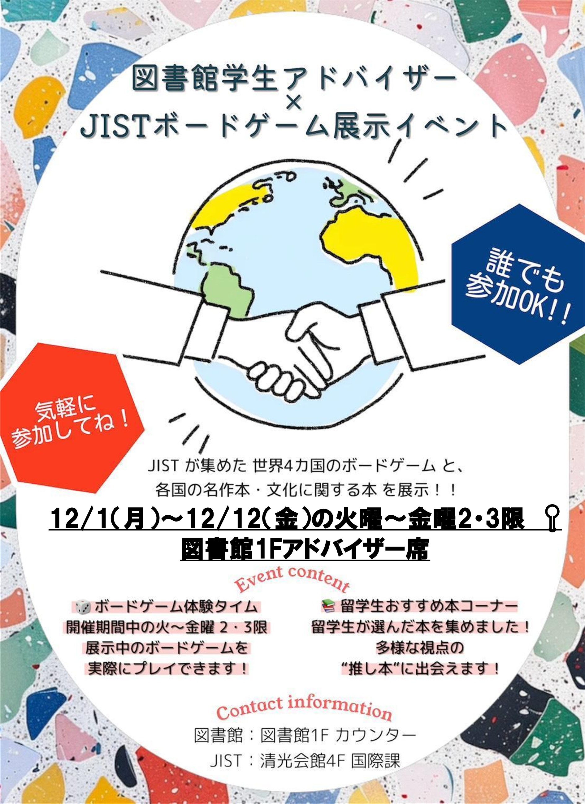 12月1日(月)から12月12日(金)の期間、学生アドバイザーとJISTの合同企画として、他国の文化や遊びを発信し、留学生との交流の場を作ることを目的としたイベントを開催しました。