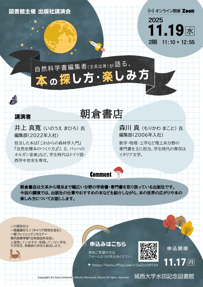 文系から理系まで幅広い分野の学術書・専門書を取り扱っている朝倉書店の、編集部で活躍されている井上氏と森川氏を講師にお迎えし、ご講演いただきます。