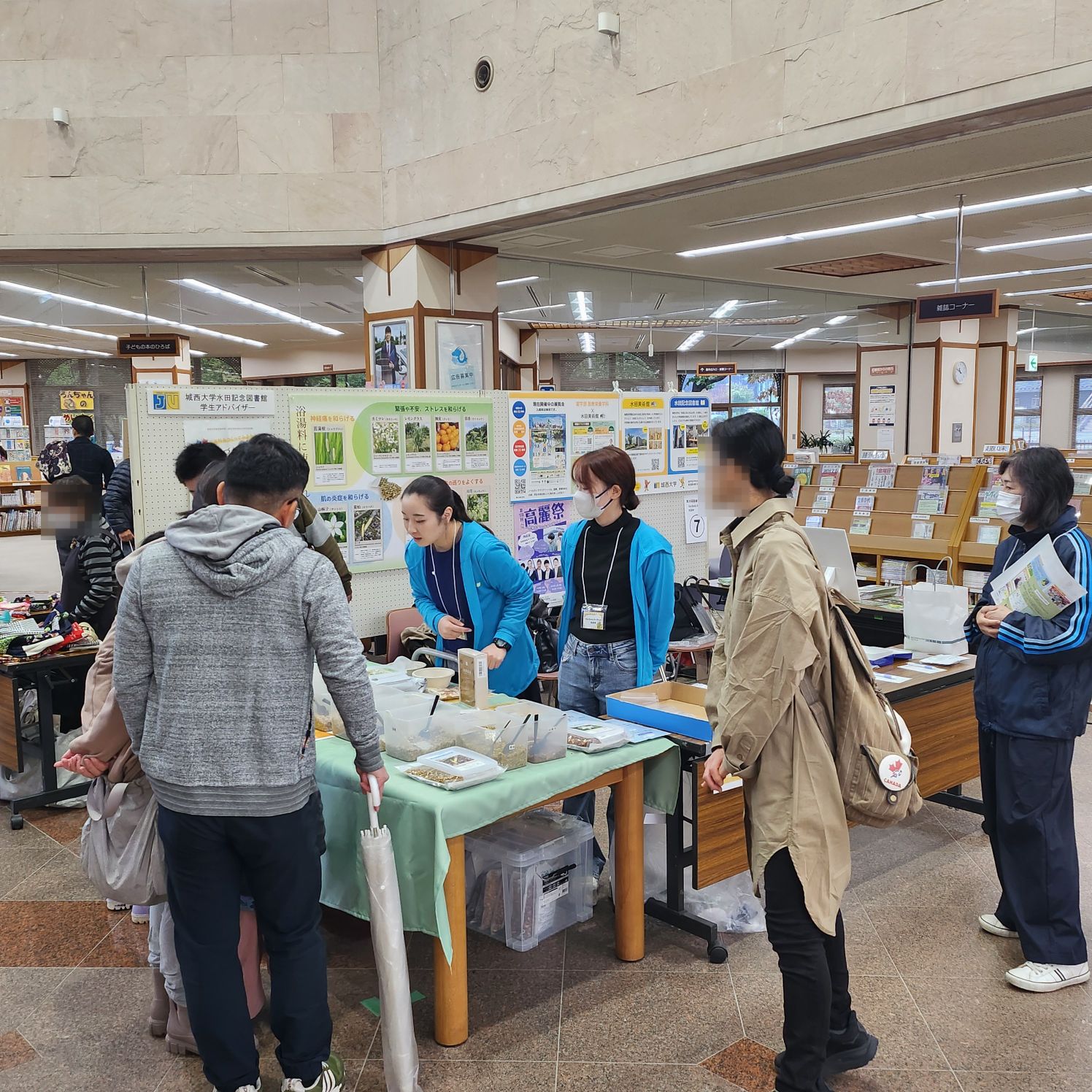 城西大学図書館利用案内の他、薬用植物園のパンフレットやポストカードをお配りしながら、学生アドバイザーが中心となりご案内しました。