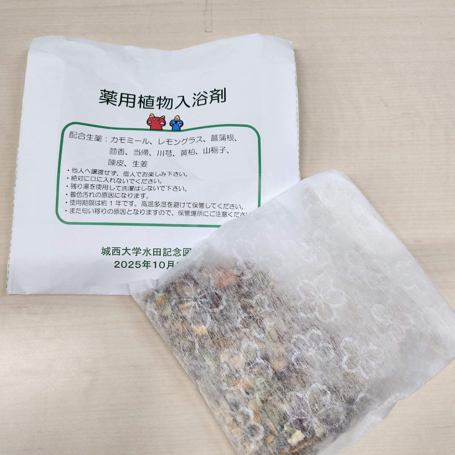 2日目は、前年度に続き薬学部薬学科 生薬学研究室 北村雅史准教授にご指導いただき、薬用植物に関する関連図書の展示とともに、身近にある薬用植物を使った浴湯料づくり体験を行いました。