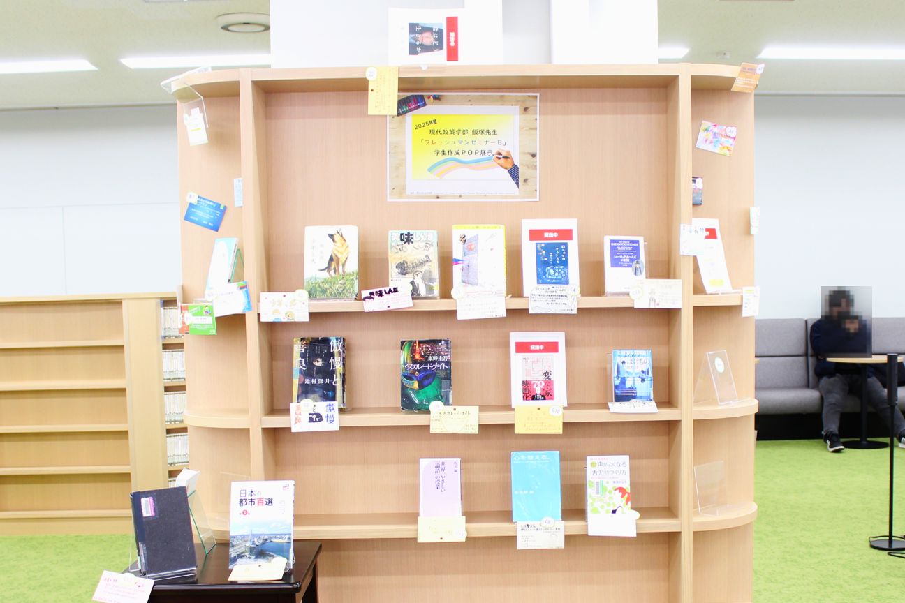 現代政策学部 飯塚智規先生「フレッシュマンセミナーB」の授業において、学生が図書館の本にPOP広告を作成し、12月10日(水)にその本とPOPを自分たちでレイアウトしました。