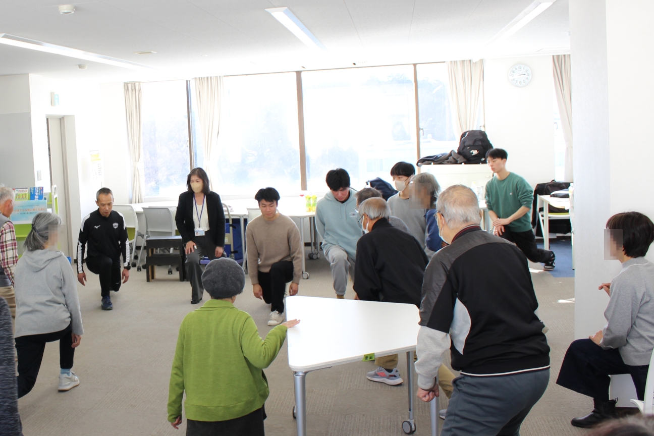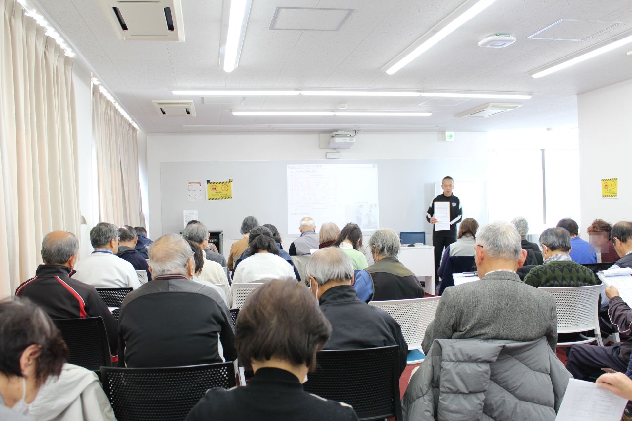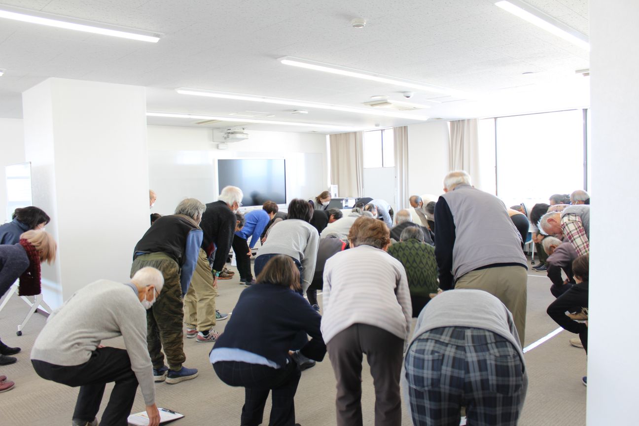 講座の最後には「片足立ち」や「スクワット」など、自宅で簡単にできる予防運動を、参加者全員で実践しました。