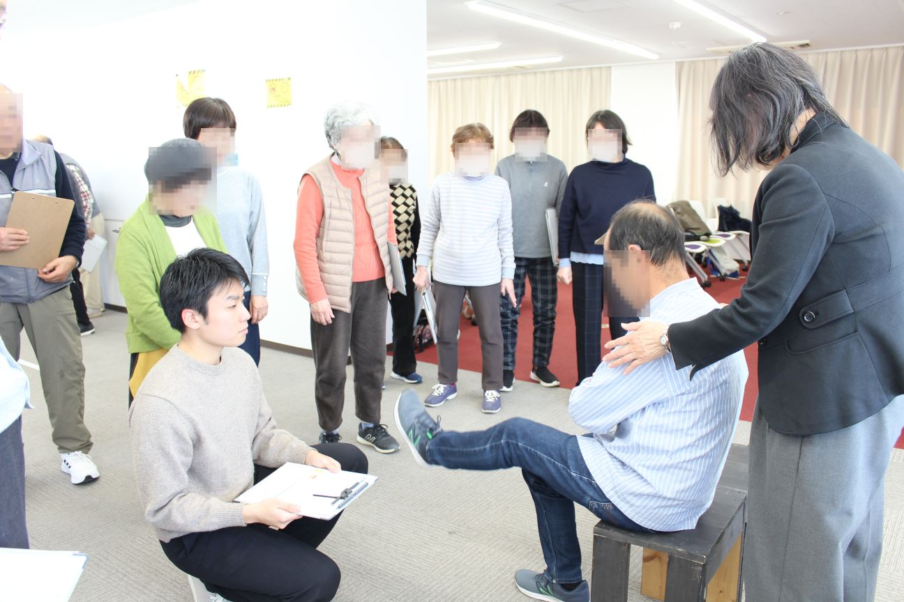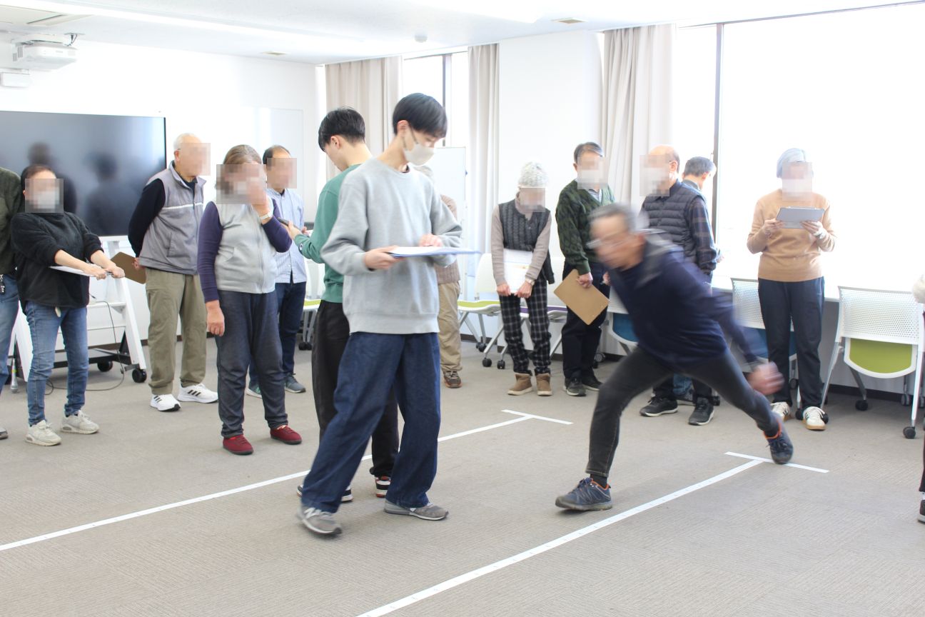 まずは先生のご指導のもと、ロコモティブシンドロームを診断するため、実際に身体を動かす測定と、設問の回答によるテストを実施しました。