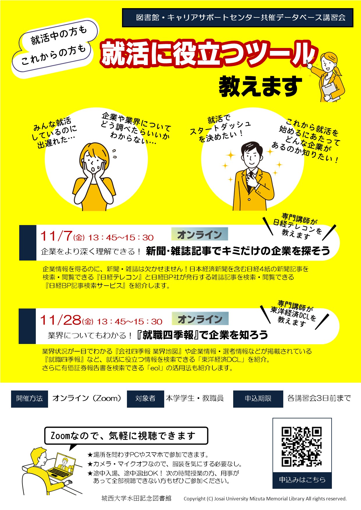 新聞・雑誌記事をレポートに活用!「日経テレコン」・「日経BP記事検索サービス」講習会をオンライン開催します。
